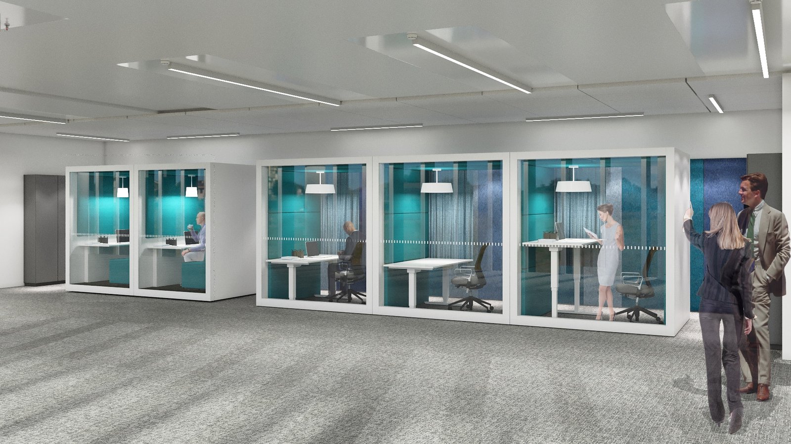As new products, we are bringing POD OPEN and POD ROLL DUO to the fair. POD OPEN is a workspace for 1–4 people, depending on the furniture solutions. It is an open space, the walls and ceiling are covered with acoustic panels, and its sound-absorbing interior curtain brings privacy and working peace. The space is completely accessible.