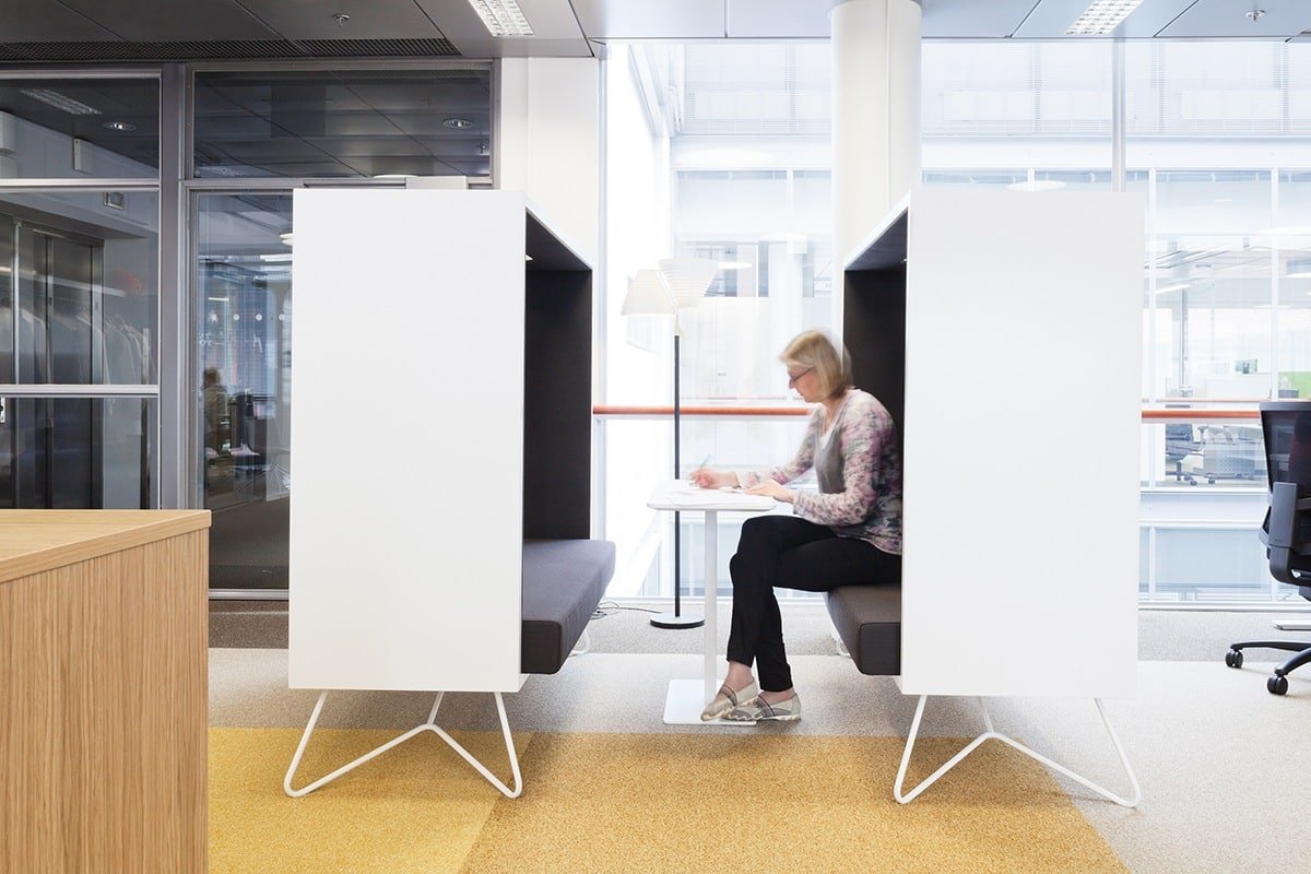 ”Innovatiivisen suunnittelun ja ääniystävällisten rakennusmateriaalien ansiosta INTO-kalusteet eristävät tehokkaasti ääntä avoimessa tilassa.”