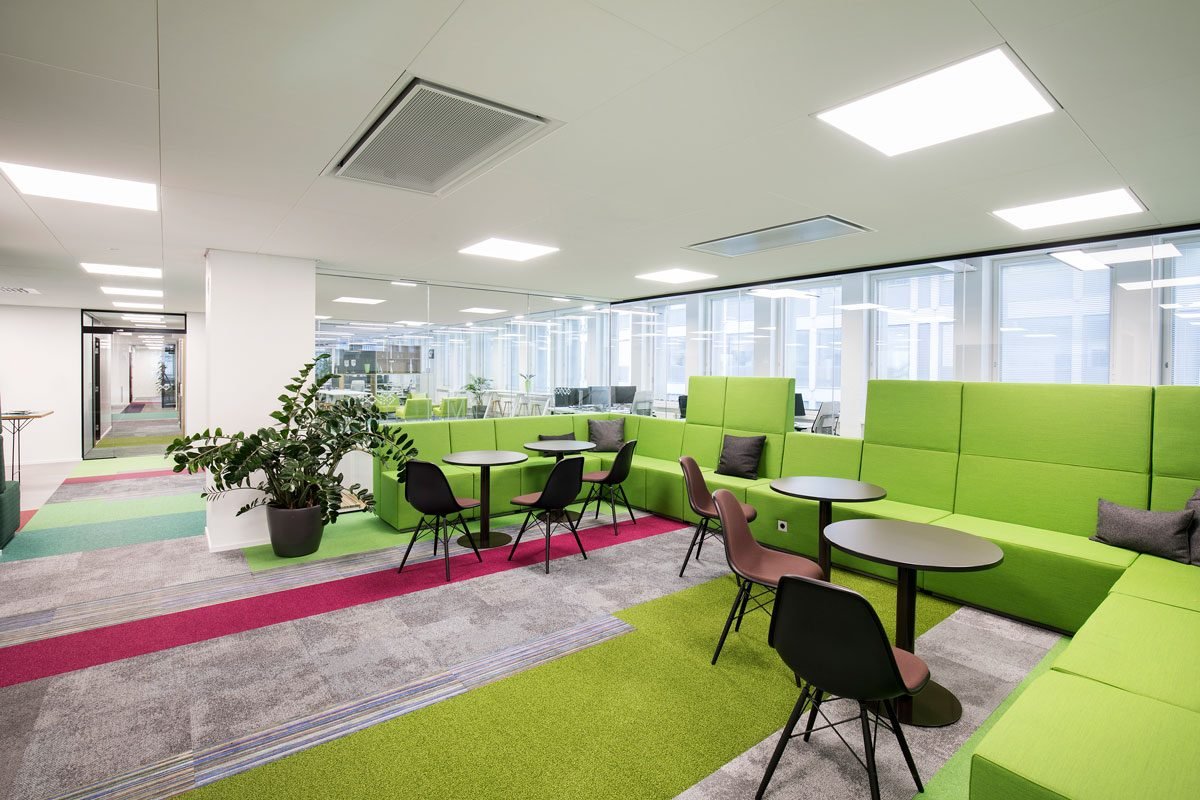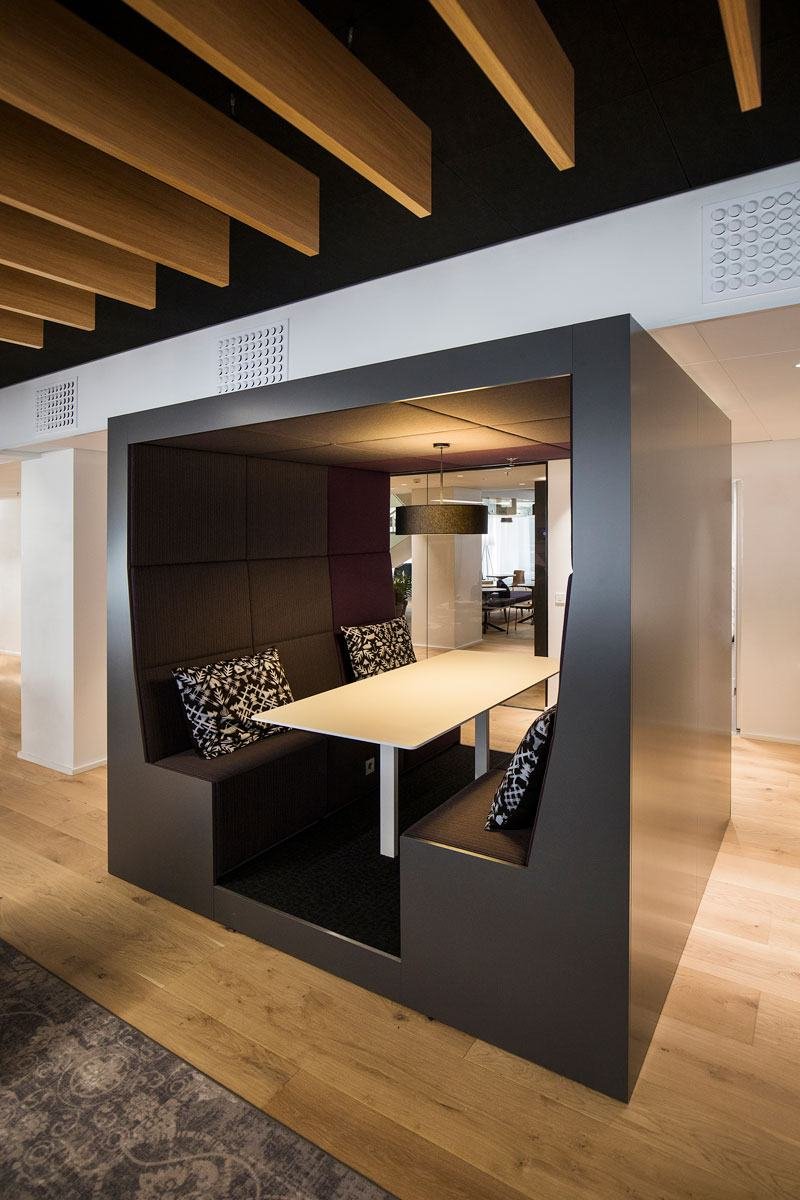 Ääntä vaimentavia, ergonomisia POINT sohvia on sijoitettu sekä neuvotteluhuoneisiin että taukotiloihin, joissa ne muodostavat seurusteluun kutsuvia istumaryhmiä. Yhteisöllisissä tiloissa on myös helposti siirrettäviä, vaimennuselementein varusteltuja puoliavoimia POD ROLL tiimityötiloja. Työpisteiden läheisyyteen taas on sijoitettu tukitiloiksi modulaarisia INTO POD -huoneita, jotka tarjoavat rauhaisat puitteet niin keskittymistä vaativaan työskentelyyn kuin neuvotteluihin.