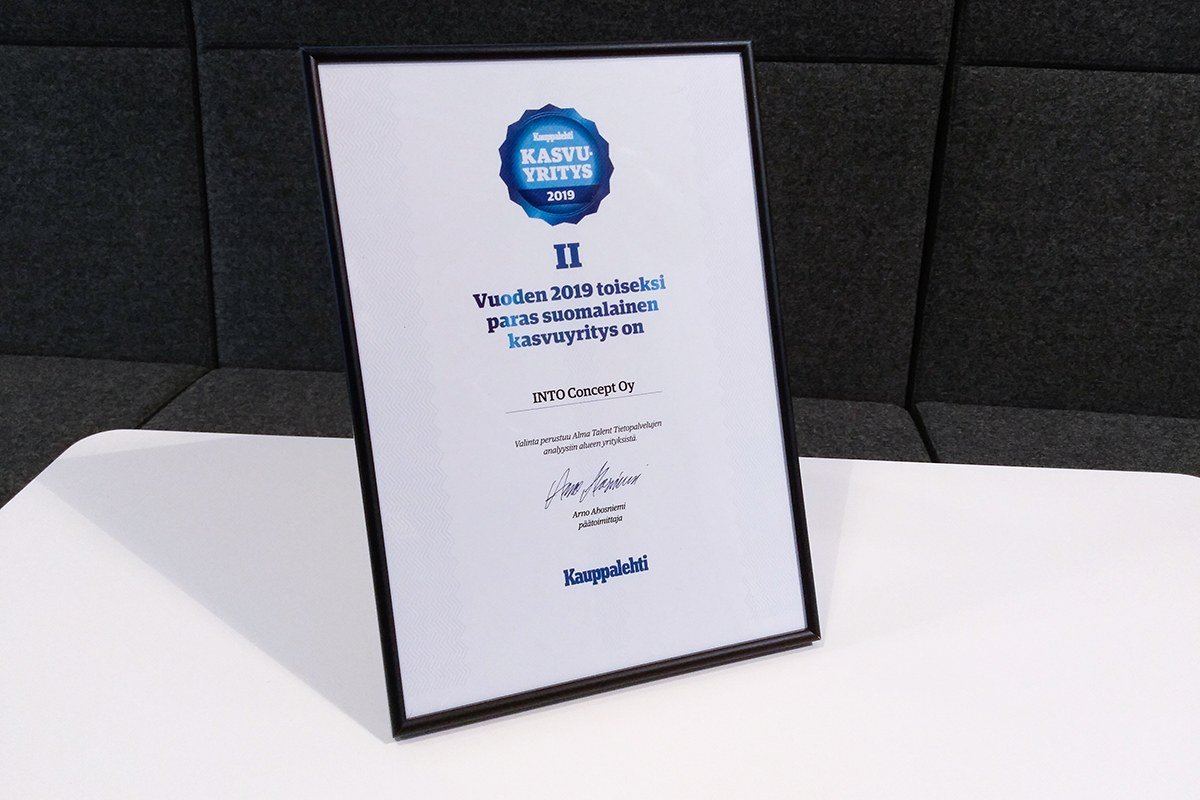 Suomen suurin taloussanomalehti Kauppalehti palkitsi toimistokalusteyritys INTO Conceptin vuoden 2019 toiseksi parhaana suomalaisena kasvuyrityksenä. Ensimmäisen paikan vei peliyhtiö Small Giant Games ja kolmannelle sijalle tuli liikkumissovellus Whimistä tunnettu MaaS Global.