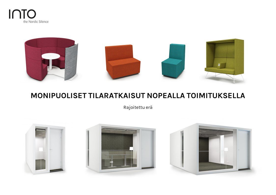 Varastokampanja sisältää alla olevia INTO tuotteita.  Ole siis nopea, sillä tuotteita on vain rajallinen määrä! Tee löytöjä huippulaadukkaista tuotteista ja nappaa toimistollesi POD huoneita, istuinkalusteita, pöytiä ja oheistuotteita edulliseen hintaan!