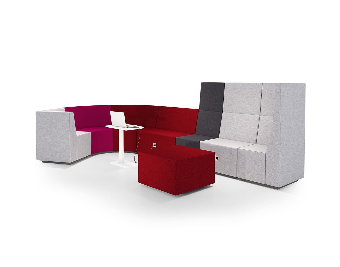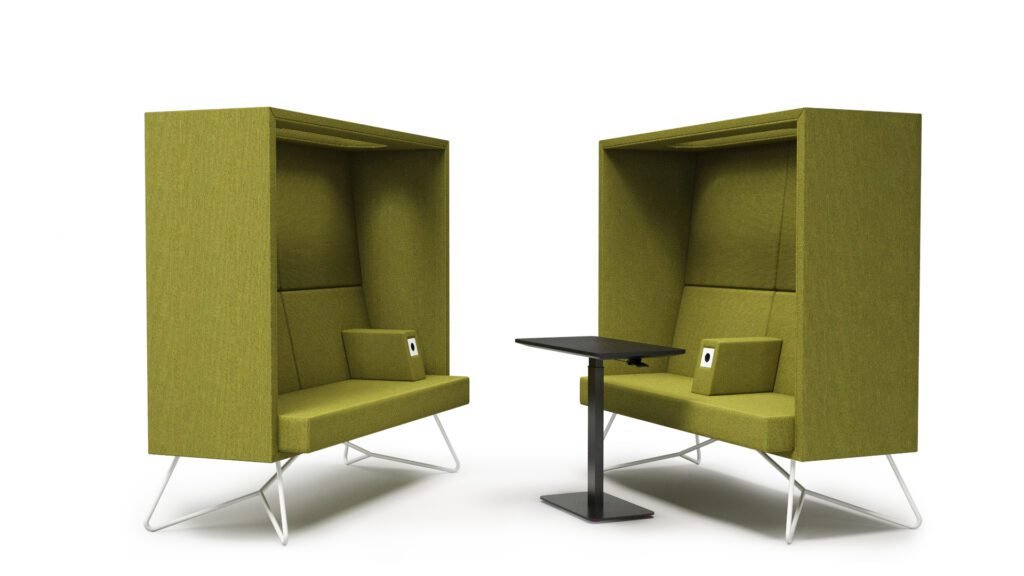 The CUBE lounge sofa is an ideal solution for small spaces where room-like silence is needed. Two opposing sofas create a private and quiet area. The movable armrest includes a power outlet, allowing you to charge a laptop or phone.