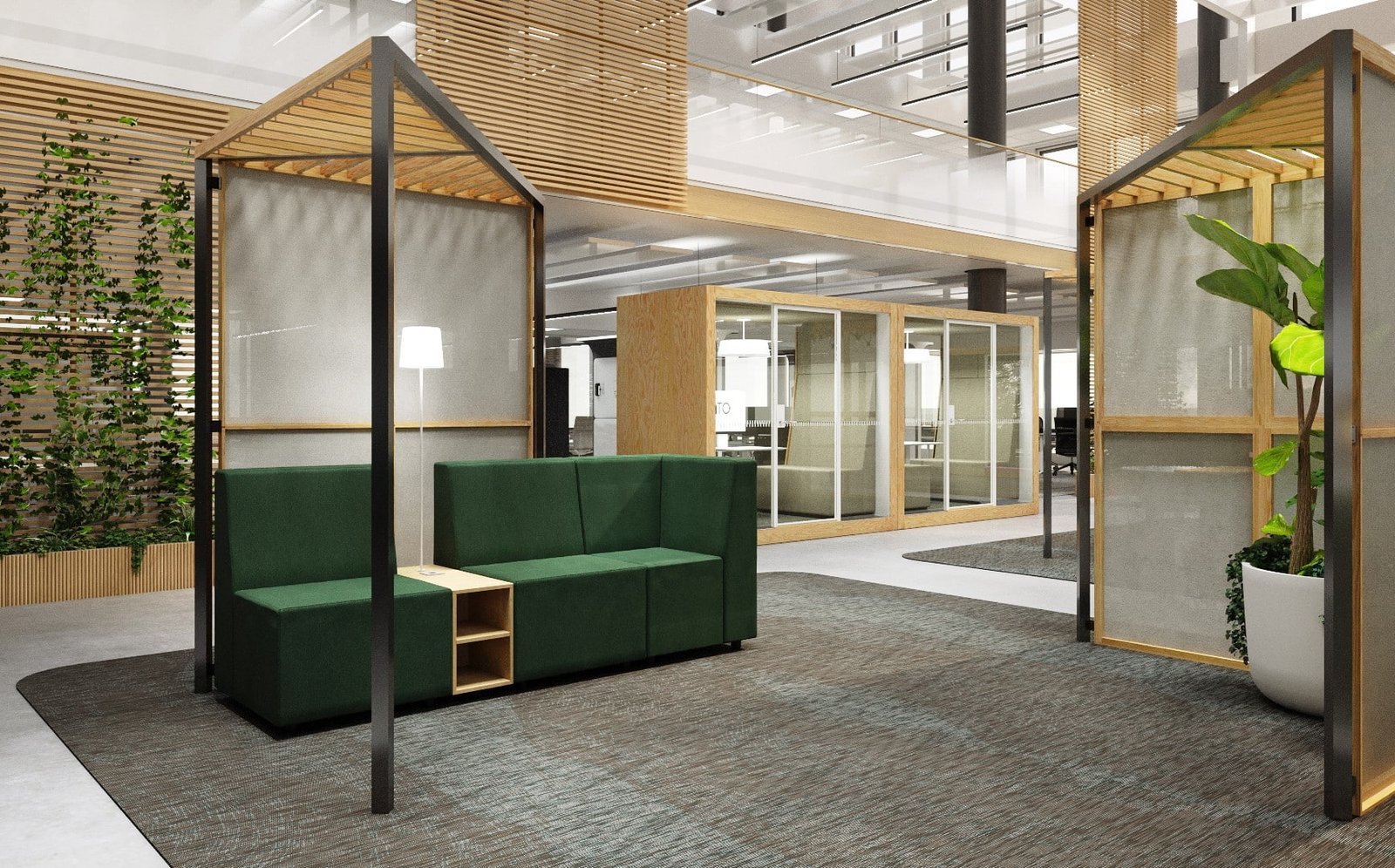 HUT – a modular design solution created in collaboration with Jokinen Konu Design Oy. HUT is an indoor pergola designed to divide spaces while creating a sense of protection and calm in open environments. Its greatest strengths are adaptability and versatility. By combining multiple HUT units, you can form plaza-like areas or corridor-style layouts. With removable modular screens, the space can be defined entirely according to your needs. The translucent fabric allows natural light to pass through while still providing privacy.