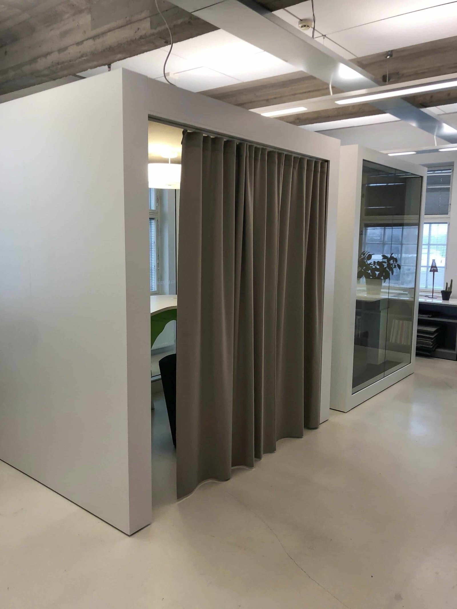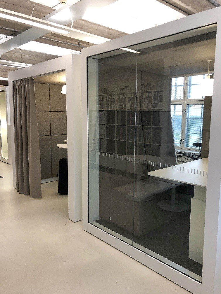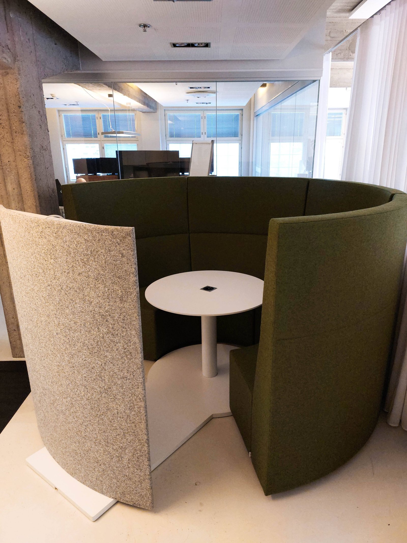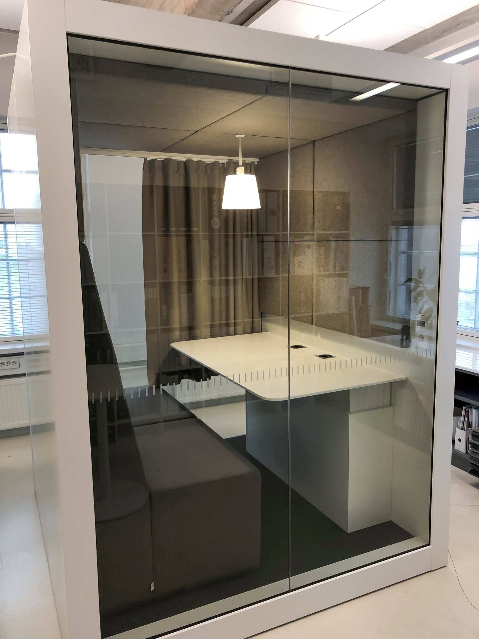 POD ROLL DUO is a working station for 1-2 people. It has a built-in sofa, a height-adjustable electrical table, two table sockets, one wall socket, and a motion detector to set on the lights. The walls and the ceiling are covered with acoustic panels.
