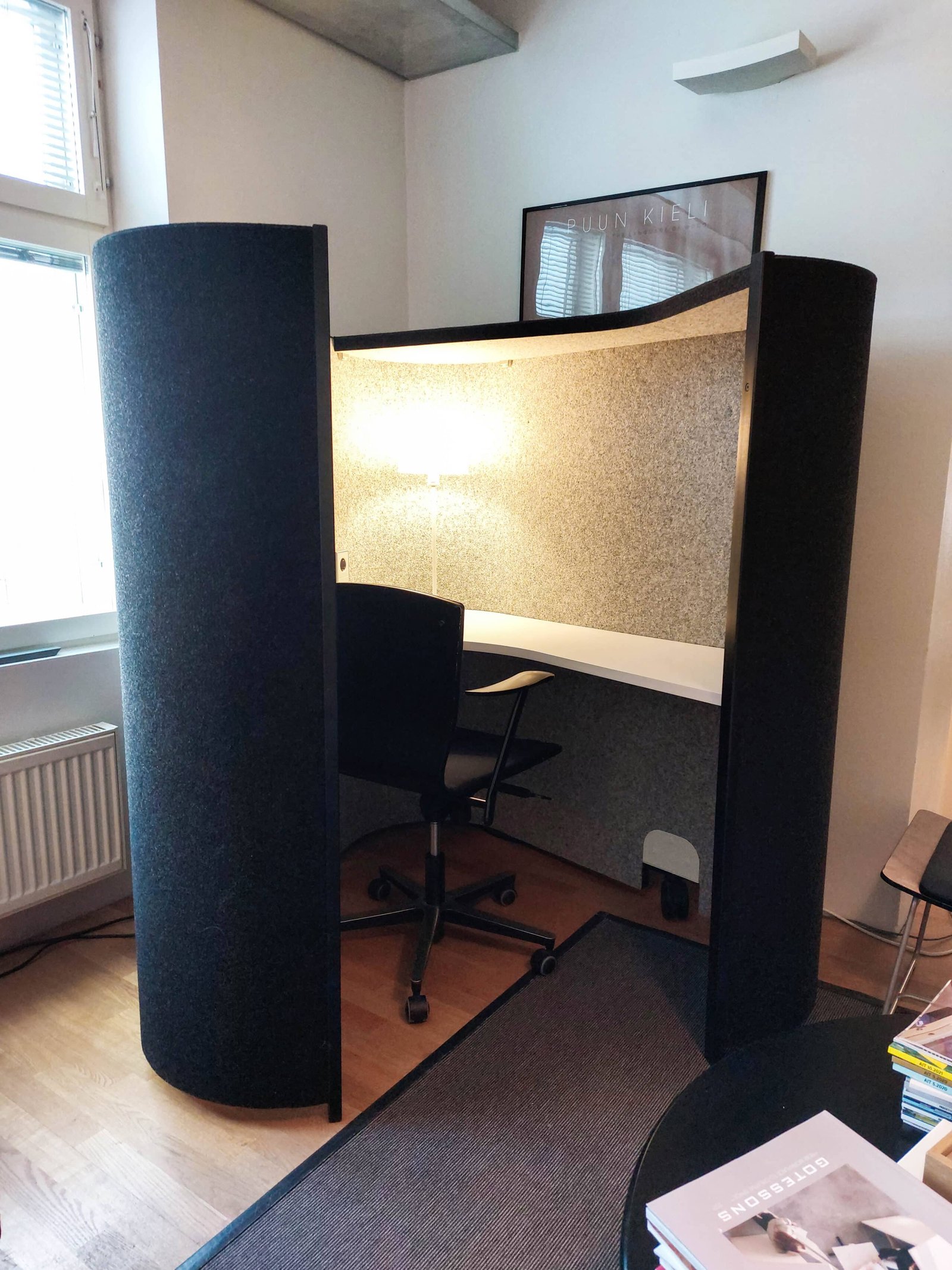 We also received the ROLL IN table solution to our showroom. This ROLL IN has an oak surface and oak table combined with black steel legs. Inside the cover is acoustic paneling to give you some extra peace. There’s also an acrylic window with opaque glass to emit light in.