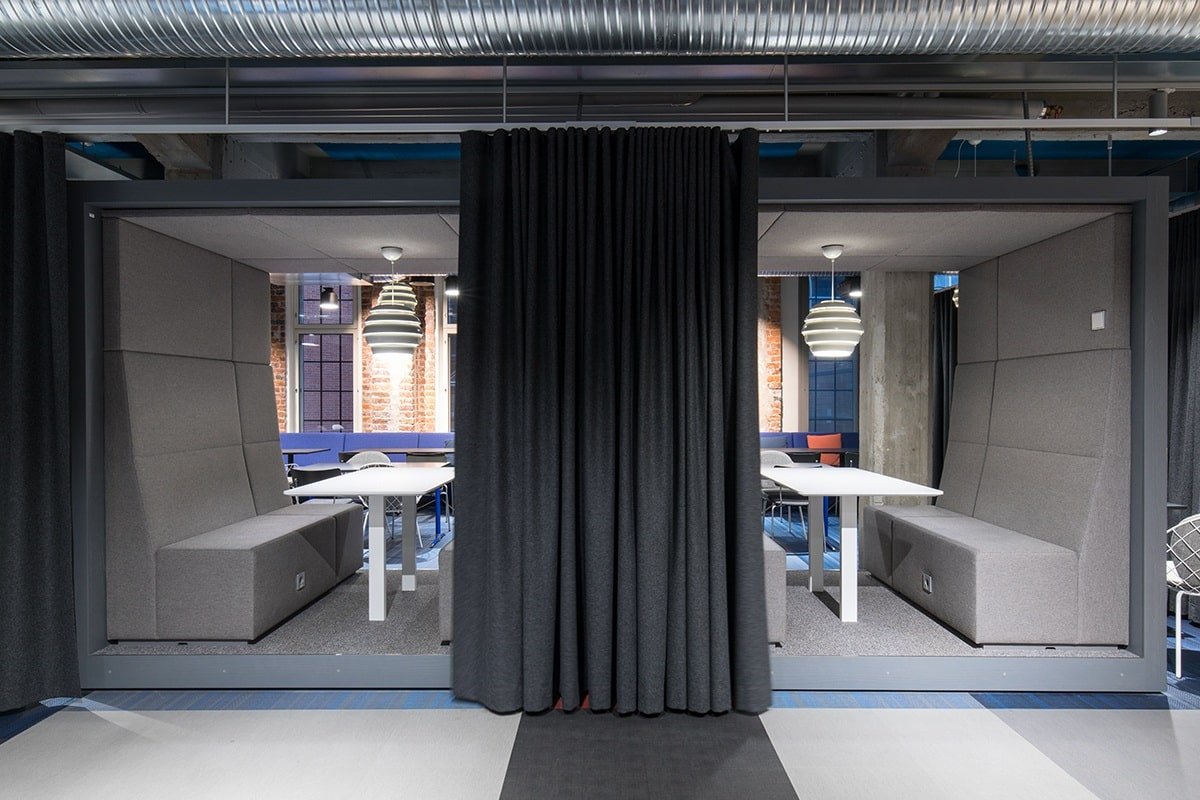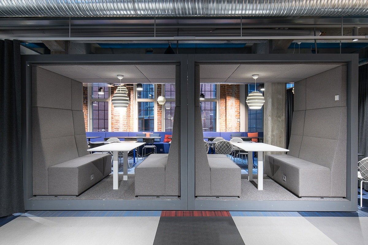 The space needed to be visually divided into different areas that create changing moods for both lunch and work. The original industrial aesthetics of the building were brought up and underlined with great discretion. The goal of the restaurant area is to attract employees to work at the premises also outside of the lunch hours. This was implemented with adaptable INTO the Nordic Silence space solutions like multiple POD ROLL SMALLs dividing the space and offering a room-like place for ad-hoc meetings or to just have a cup of coffee with a colleague, and POINT sofas to create comfortable yet ergonomic lounge areas.