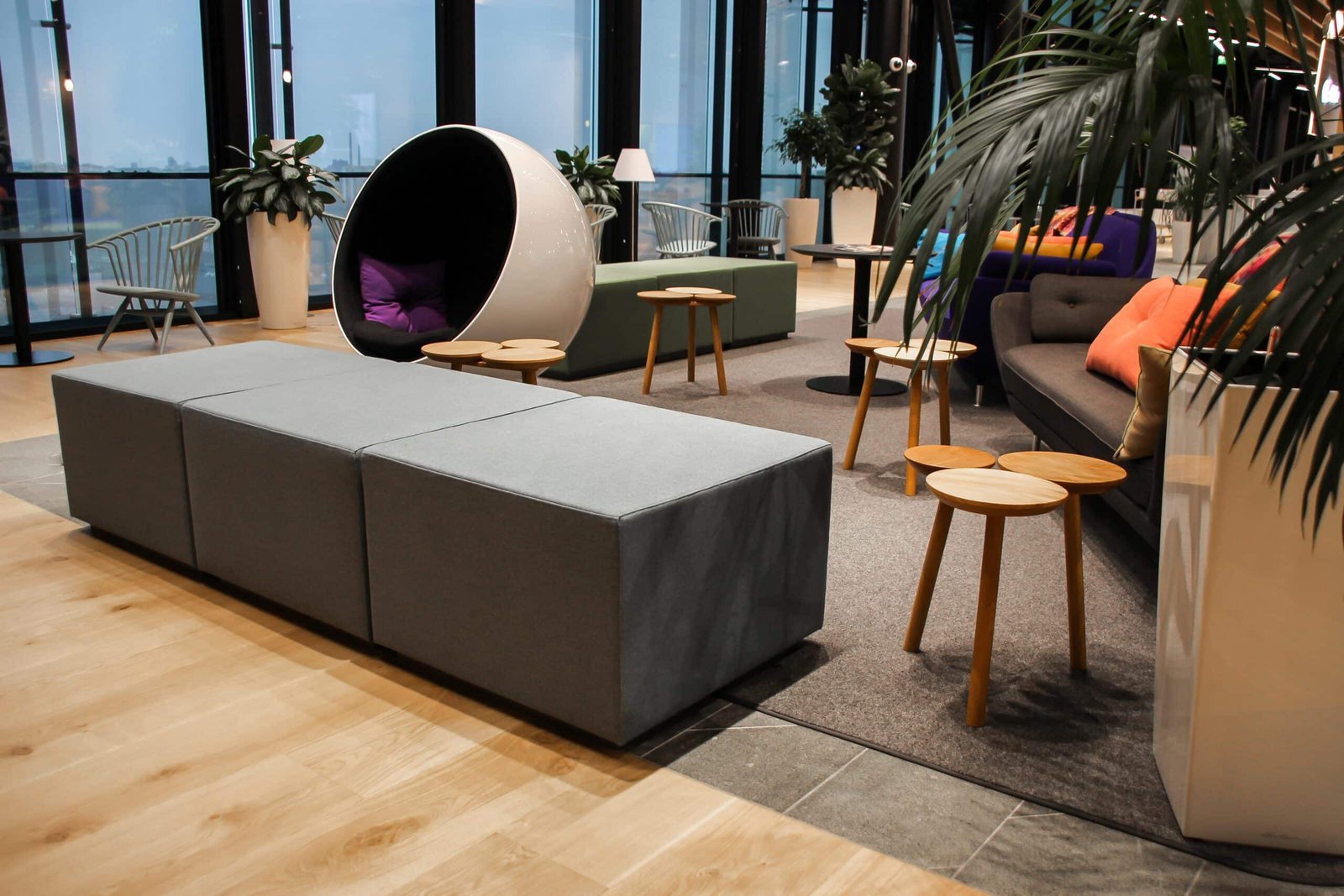 Ergonomic POINT sofas were placed around the floors of the office towers. The timeless design language of the sofas and the wide range of fabric and color options made it possible to place them in any space, regardless of theme and era. POINT sofas with sturdy seat cushions combined with height-adjustable TOP LIFT tables provide a comfortable workspace for even longer periods. The sofas have integrated sockets for charging electronic devices.