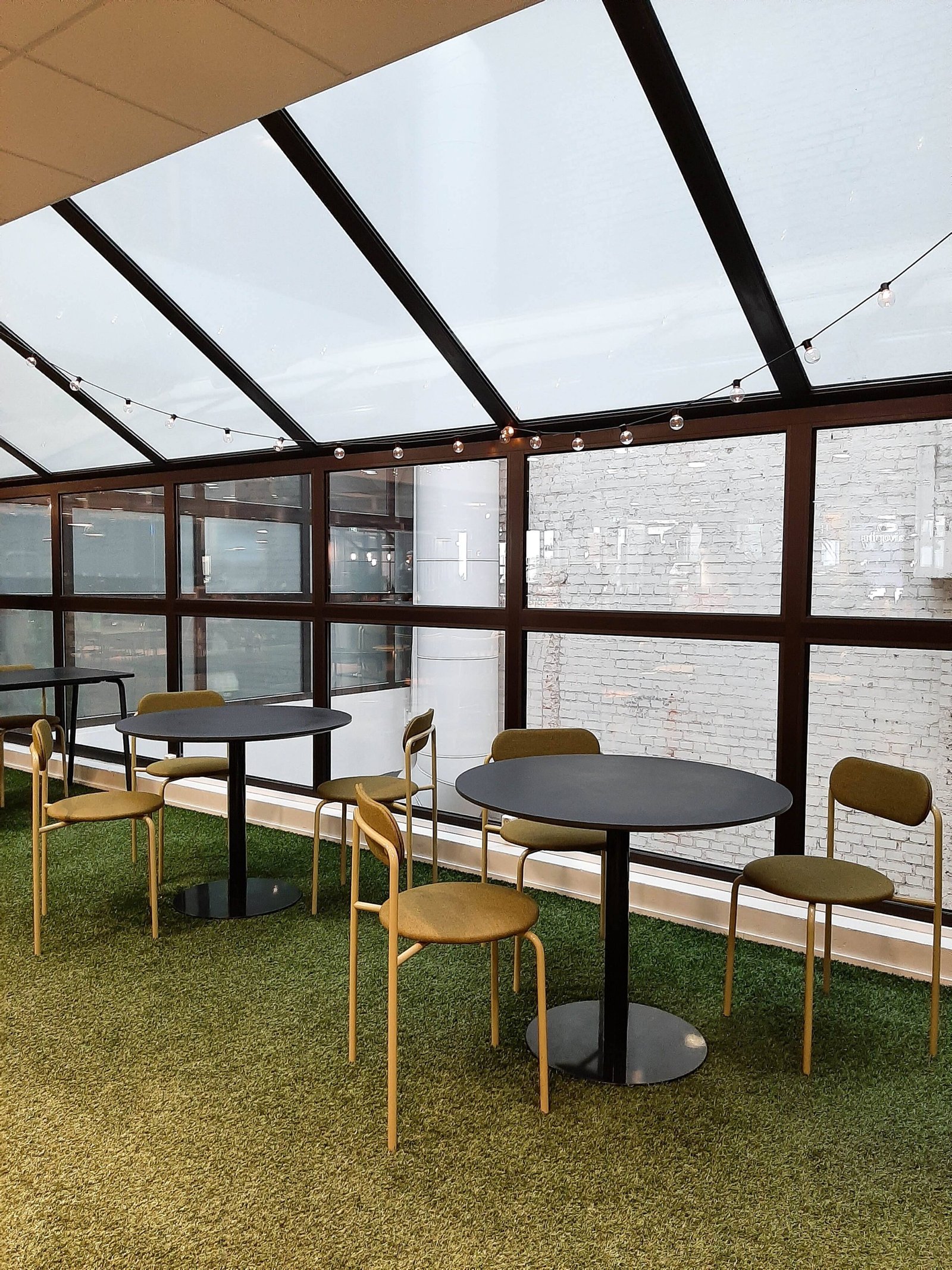 INTO POINT sofas were chosen for the restaurant and they bring a softness to the space and improve the acoustics. The upholstered sofas have high-quality backrests made of wool, and the wipeable seats provide much-needed color to the space and are easy to maintain. The sofas are recycled and have been in minimal use at fairs. The seats have been re-upholstered with wipable fabric. The rows of sofas divide the large space and ground some of the separate furniture such as tables and chairs in front of the sofas. The sofas are designed so that they are at a suitable height for dining and firm enough for sitting and studying for long periods of time.