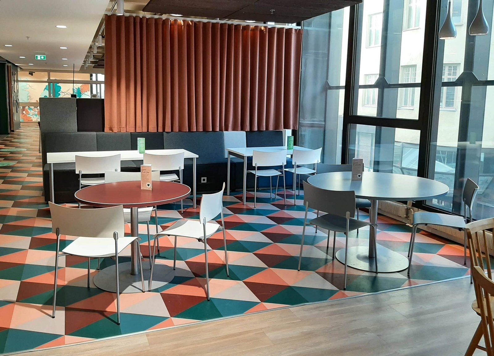 The renewed and more functional Unicafe Kaivopiha opened in the autumn of 2019. UniCafe Kaivopiha is the largest student restaurant in Helsinki, and it has over 2 000 visitors per day. The objective of the renovation was to make the space more efficient and cozy and less noisy. Floor materials with excellent impact sound qualities were chosen and elements such as thick wool partition curtains were added to enhance the acoustics of the space.