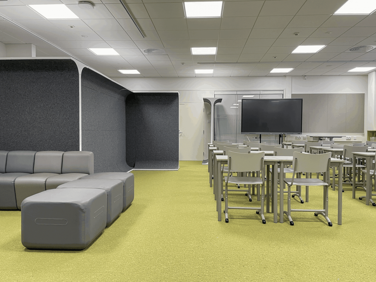 These solutions made it possible to create learning environments that are pedagogically effective, visually clear, and acoustically calm. They support both individual work and group activities.